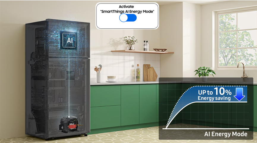 قلل استهلاك الطاقة بنسبة تصل إلى 10% مع وضع الطاقة المعزز بتقنية AI في خدمة SmartThings Energy. إذا تجاوزت فاتورة الكهرباء القيمة التي حددتها مسبقاً، فستتم إتاحة خيار لتوفير استهلاك الطاقة. يساعد ذلك في ضبط سرعة الضاغط ودورة التذويب بذكاء بناءً على نمط استخدامك والأجواء المحيطة.